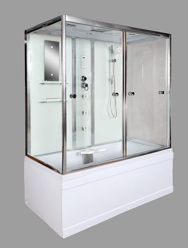 Стильная душевая кабина с внутренней сборкой AvaCan V160 сочетает в себе высокую функциональность, практичность и надежность. Для изготовления применяют безопасное закаленное стекло толщиной 5 мм, надежно фиксируемое алюминиевым профилем. Цвет профиля хром. В комплекте зеркало, сенсорный пульт управления, передний съемный экран, донный клапан (клик-клак), душевой гарнитур, тропический (верхний) душ, откидное сиденье, гидромассажные форсунки, смеситель, переключатель режимов, вентиляция, радио.