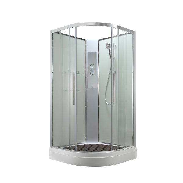 Стильная душевая кабина AvaCan EM2010NT сочетает в себе высокую функциональность, практичность и надежность. При изготовлении применяется безопасное закаленное стекло толщиной 5 мм (прозрачное), надежно фиксируемое алюминиевым профилем. Сборка без силикона (увеличивает срок службы), внутренняя сборка(облегчает установку и ревизию; позволяет установить в ограниченном пространстве), смеситель резьбовой (без хомутов). Съемный экран поддона (позволяет осуществлять ревизию сифона). Цвет профиля  хром. Двойные металлические ролики дверей (увеличивают срок службы).В комплекте : душевая штанга, две полочки , арома-лейка с витамином С (картридж съемный),полимерная вставка в поддон(имитация дерева),сифон, ручки дверей из нержавейки , двойные ролики .