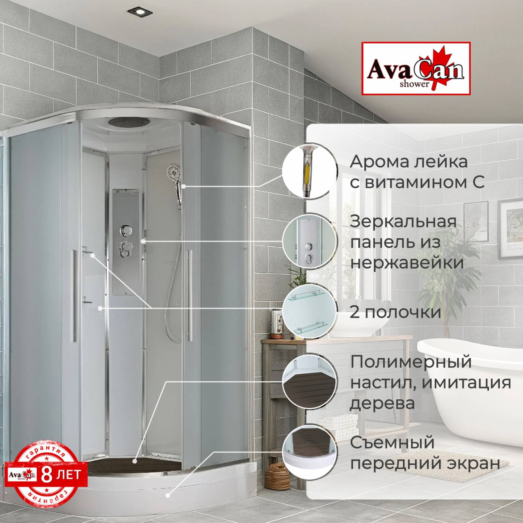 Стильная душевая кабина AvaCan сочетает в себе высокую функциональность, практичность и надежность. При изготовлении применяется безопасное закаленное стекло, надежно фиксируемое алюминиевым профилем. Профиль сделан из алюминия повышенной прочности. Сборка без силикона (увеличивает срок службы, защищает от протечек), внутренняя сборка (облегчает установку и ревизию; позволяет установить в ограниченном пространстве и обойтись без демонтажа других сантехнических приборов), смеситель резьбовой (без хомутов). Съемный экран поддона (позволяет осуществлять подключение и ревизию сифона).Двойные металлические ролики дверей (распределение нагрузки на два ролика, увеличивают срок службы). Душевая штанга(позволяет регулировать по высоте ручную лейку), ручная арома-лейка с витамином С (картридж в комплекте,есть возможность замены или удаления картриджа), полочки(из стекла, с ограничителем), сифон с гидрозатвором.