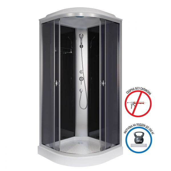 Двери и передние не подвижные стенки, сделаны из каленого стекла тонированные.Смеситель имеет два положения, включение тропического душа и дополнительной душевой лейки. Механизм керамический картридж.Комплектация: Поддон, сифон, панель, 4 профиля, 2 передние неподвижные стенки, 2 двери, 2 задние стенки, ручки, 4 ролика одноколесные, центральная панель, смеситель. крыша, полочка.