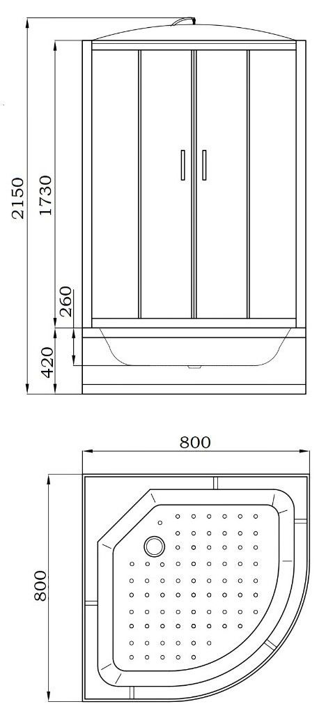 Поддон: высокий 42 см, полукруглый, рельефное дно, литое сиденье.