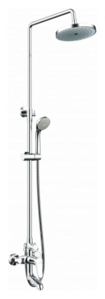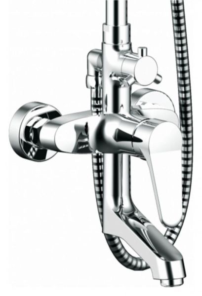 Душевая стойка для ванны Bravat Eco с большим плоским диском верхнего душа и смесителем с поворотным изливом. Серия известна не только своим качеством, но и высоким уровнем эргономики.