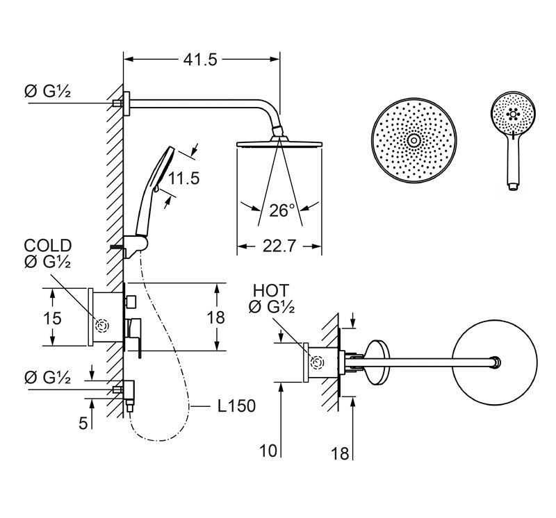 Смеситель скрытого монтажа, переключатель на 2 положения, верхний душ, ручной душ, душевой шланг, держатель лейки.