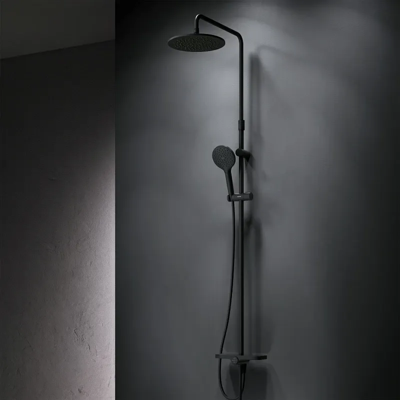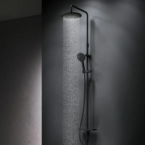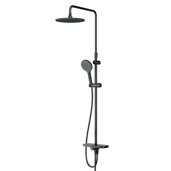 Душевая стойка Am.Pm Like F0780222 черныйДушевая система от бренда AM.PM коллекции Like представлена в современном дизайне – от пропорций ручного и верхнего душей до рисунка расположения форсунок на лейках. Цвет - черный матовый. Размер (Ш/Г/В): 254x569x1030-1460 мм. Материал душевой системы - латунь, ABS-пластик, нержавеющая сталь.