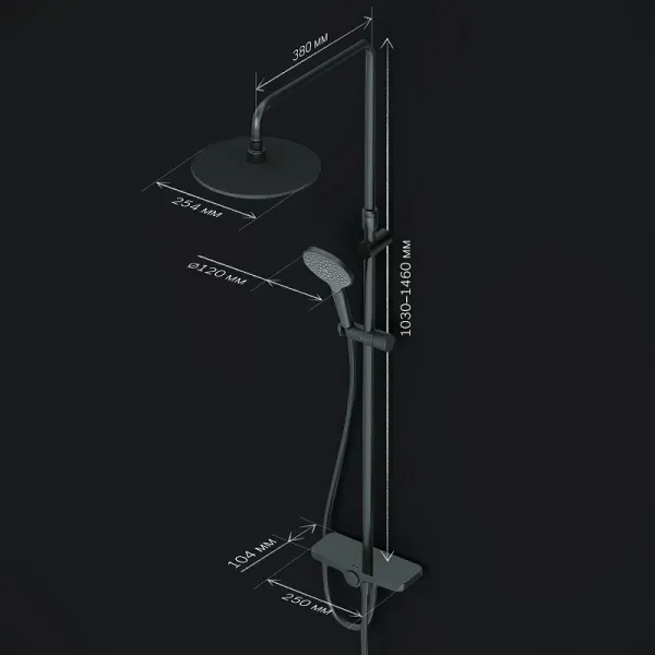 В комплектацию душевой системы входят: тропический душ, ручной душ, держатели штанги и душа. Длина душевой штанги - 1030-1460 мм. Длина душевого шланга - 1750 мм. Размер ручного душа - 120 мм. Диаметр верхнего душа - 250 мм.