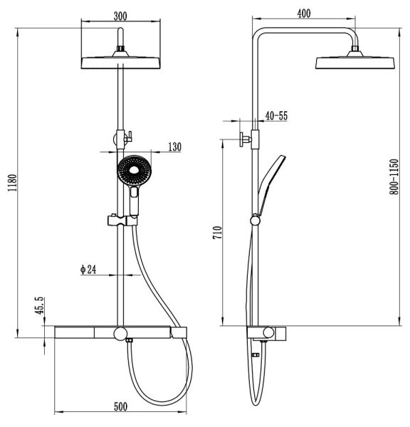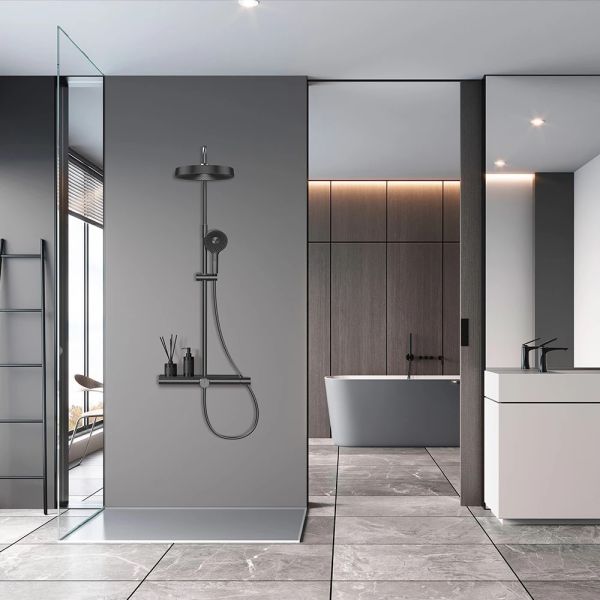 состоит из: верхний душ, ручной душ, смеситель для ванны, штанга для душа, держатель для душа; верхний душ 300 1jet; размер душевого диска: 300 мм, тип струи: Rain; душевая лейка 130 мм, 3 режима струи; съемный аэратор; шарнирное соединение: регулируемый угол верхнего душа;длина держателя для душа: 400 мм;держатель для ручного душа регулируемый по высоте; поворотный держатель для душа; вид монтажа: внешний монтаж; соединительная резьба G ½; межосевое подключение 150 мм ± 12 мм; телескопическая штанга; подъемная труба может быть укорочена по высоте 90-440 мм; полка из закаленного стекла; шланг 1500 мм; 2 года гарантии.