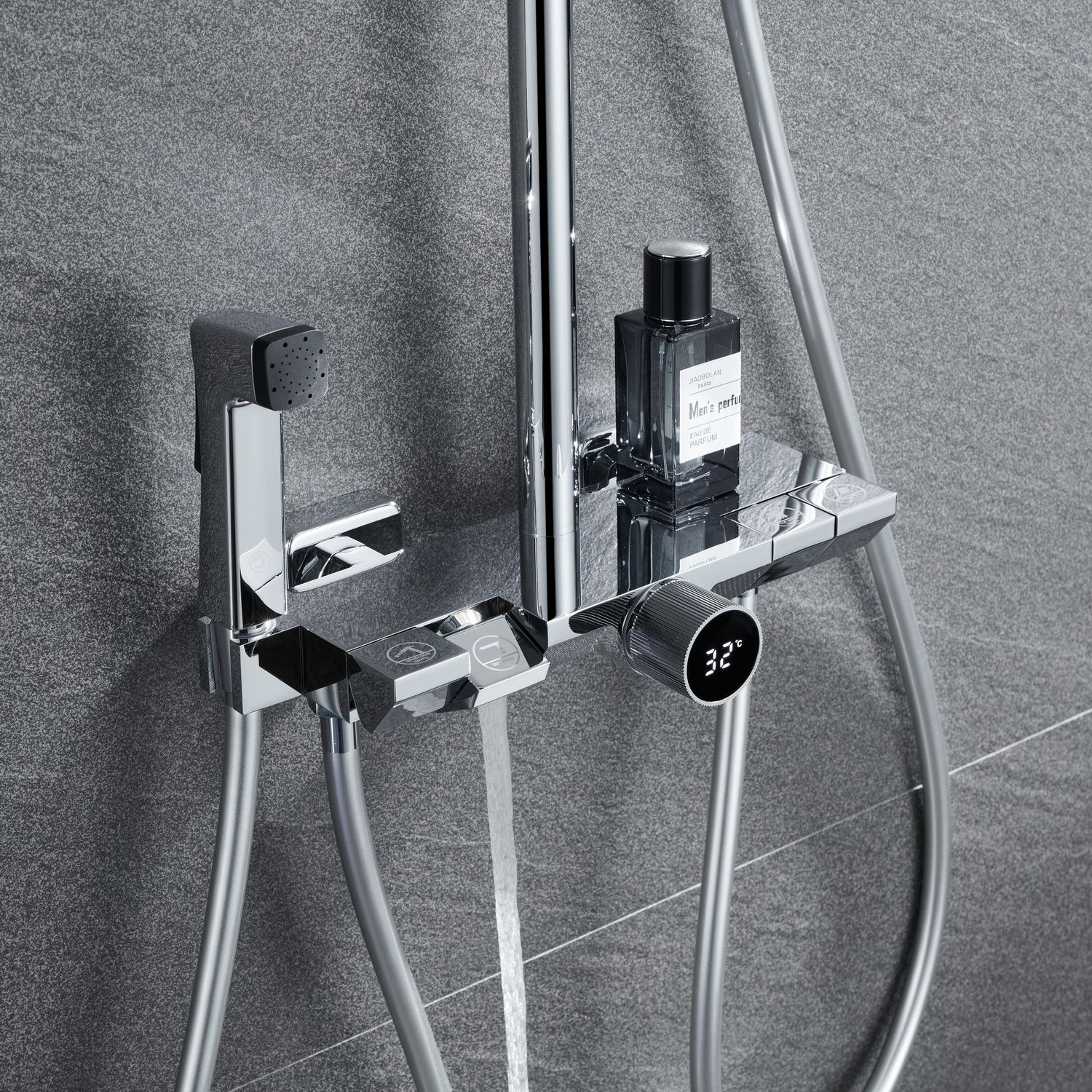 Из потребителей на системе установлен ручной режимный и верхний душ, а также излив скрытой установки и гигиенический душ. Выбор потока осуществляется через клавиши расположенные сверху корпуса смесителя.