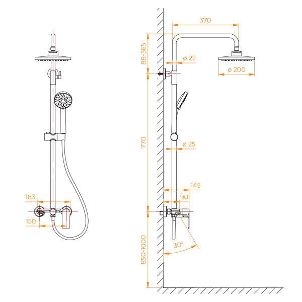 - Головной душ из высокопрочного ABS-пластика оснащён со шарнирным креплением, что позволяет выбрать необходимый угол направления воды;