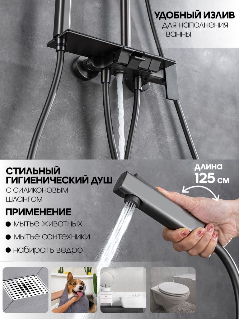 Душевой гарнитур с тропическим и гигиеническим душем Vexorus имеет возможность установки на любую поверхность. Благодаря этому вы сможете использовать ее как в ванных комнатах, так и на даче. Матовый черный цвет придает изделию особую элегантность и шарм.