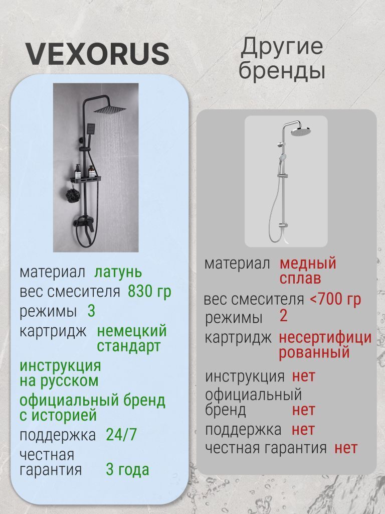 Душевая система с краном бренда Vexorus - это идеальный выбор для тех, кто ценит качество, стиль и комфорт. Представленное оборудование является надежным и долговечным, что позволяет использовать его на протяжении многих лет.