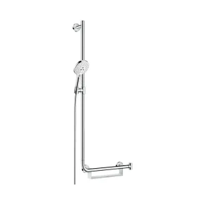 Cостоит из: ручной душ, душевая штанга, полочка, шланг для душа, ползунок размер душевого диска: 120 мм Тип струи: RainAir, Rain, Whirl полочка из белого пластика полочку можно снять удобное переключение типов струи с помощью кнопки Select со стороны душа упорный подшипник, предотвращающий перекручивание душевого шланга держатель для душа можно снять держатель ручного душа регулируется в пределах 90°, поворачивается вправо и влево, перемещается вверх и вниз полностью хромированный держатель душа из металла максимальный расход воды при 3 бар: 15 л/мин диаметр штанги 25 мм Материал: латунь хромированные настенные крепления из металла