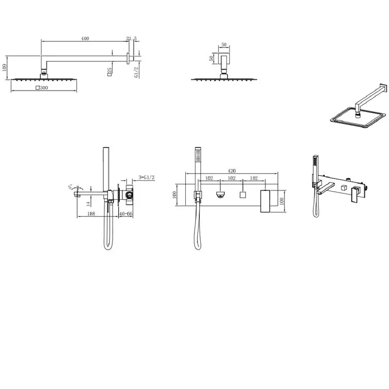 - Размер верхнего душа 300х300 мм.