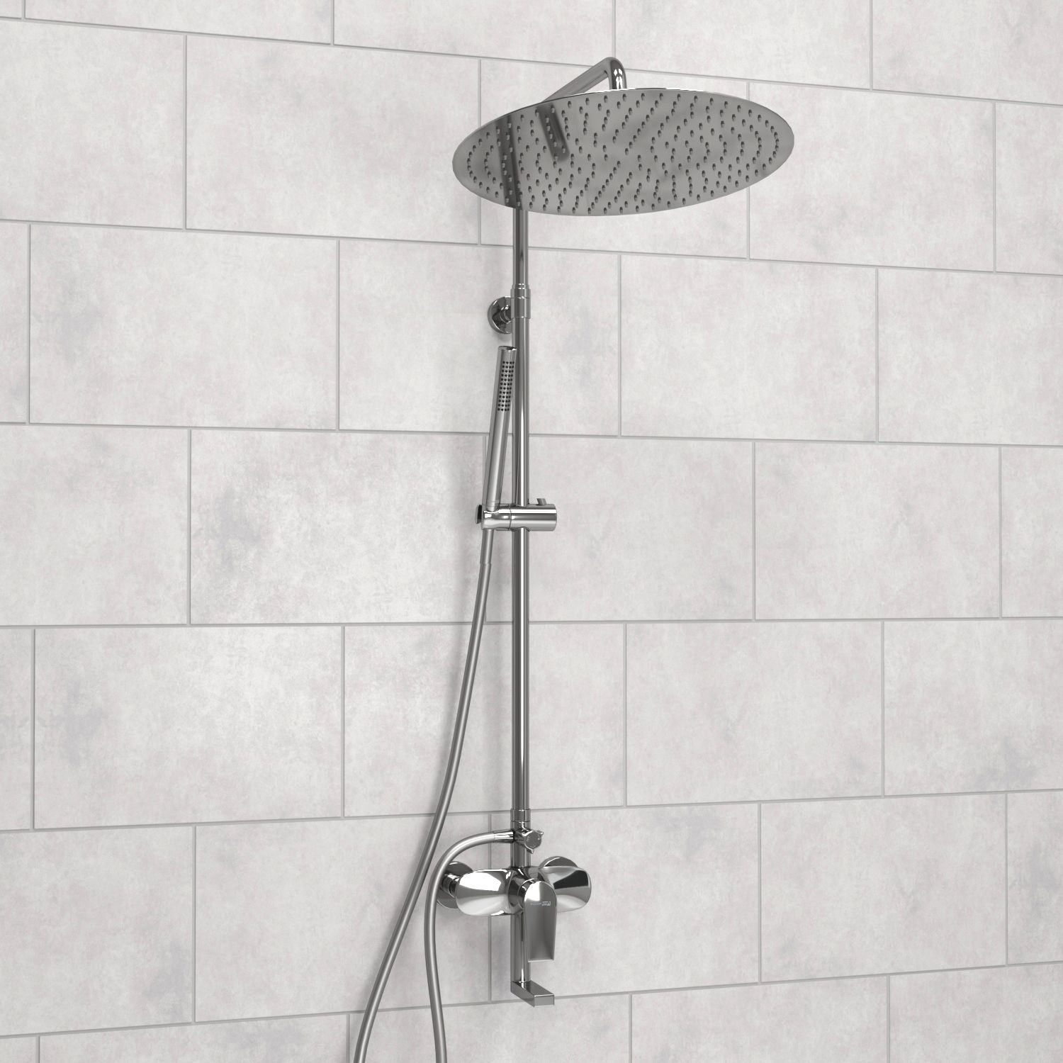 Душевой комплект легко монтируется к стене c помощью двух эксцентриков (подключение смесителя) и одного крепежного элемента (крепление стойки для душа к стене).