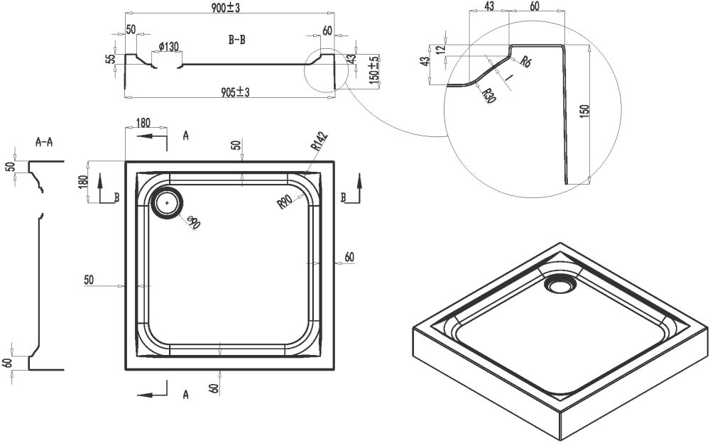 Душевой поддон Gem, несъемный экран, сифон диаметром 90 мм, надежный монтаж на регулируемых ножках.