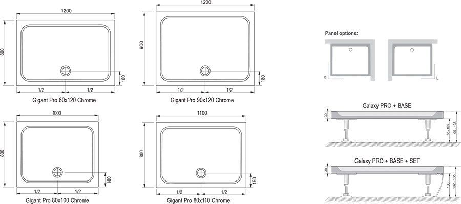 Поддон Gigant Pro Chrome подходит для душевых уголков SRV2-S+SRV2-S, ASDP3+APSS, SDZ3+PSS, SDOP+PSS, BLRV2K+BLRV2K, BLDP2+BLPS, BLDP4+BLPS, PDOP2+PPS, CRV1+CRV1, CRV2+CRV2, CRV2+CPS, SMSD2+SMPS, BSDPS, 10RV2K+10RV2K, 10DP2(+10PS), NRDP2+RPS, NRDPR4(+ RPS) и ванных комнат с душевыми дверьми ASDP3, SDZ3, SDOP, BLDP2, BLDP4, PDOP1, PDOP2, CSD1, CSD2, CSDL2, SMSD2, BSD2, BSD3, 10DP4, NRDP2, NRDP4.