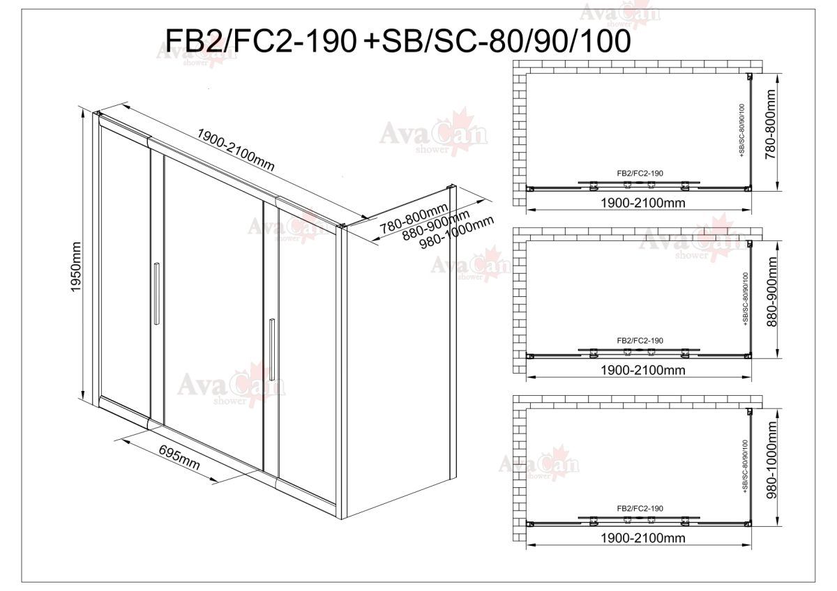 Душевой уголок AvaCan FC2 190-210 + SC90 хром