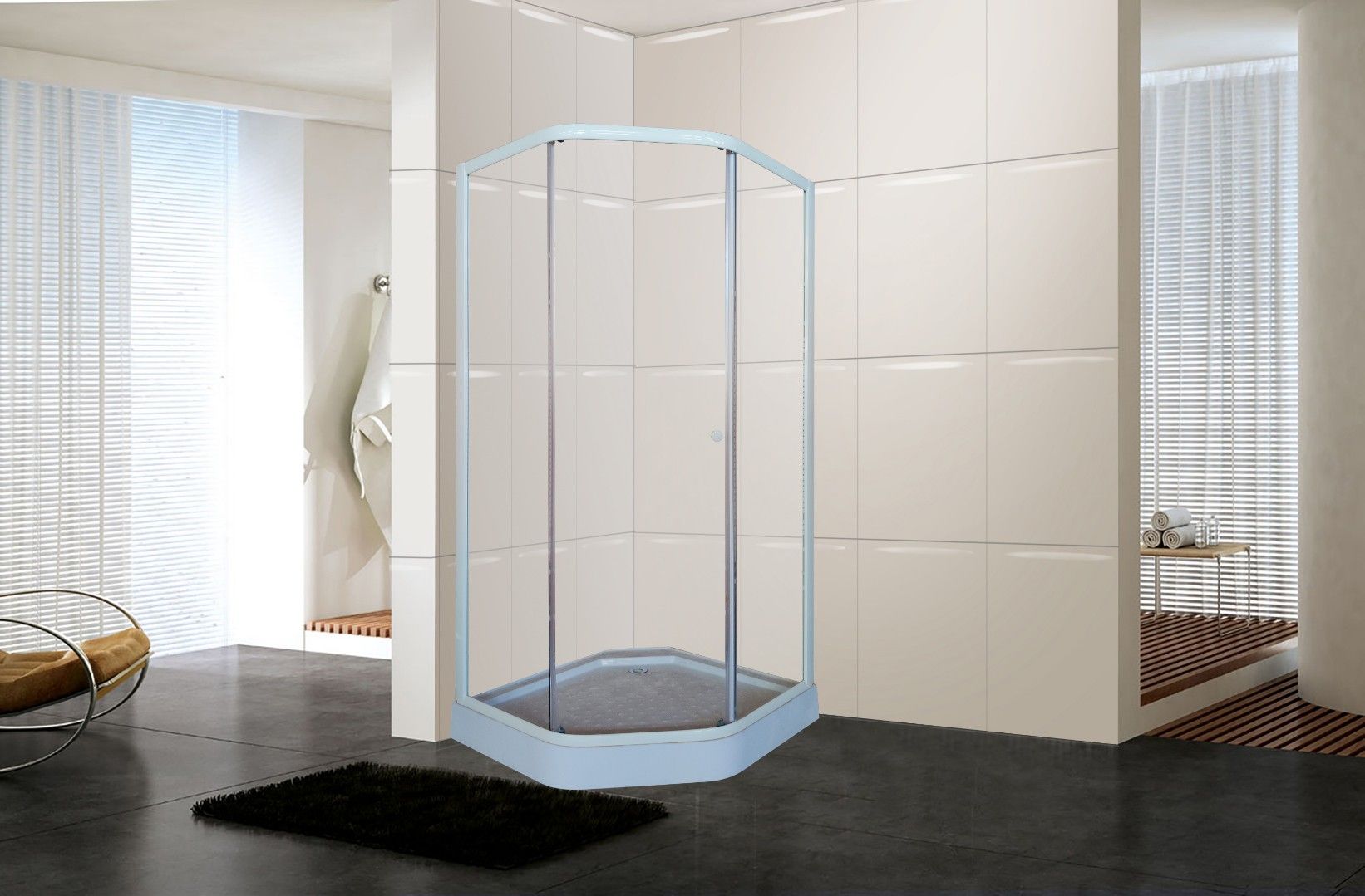 Белый профиль и прозрачное стекло придают уголку визуальную невесомость. Благодаря универсальному дизайну, уголок не будет перетягивать на себя внимание от общей идеи оформления ванной. За счет трапециевидной формы модель занимает мало места, но внутри комфортно принимать душ.Достоинства: