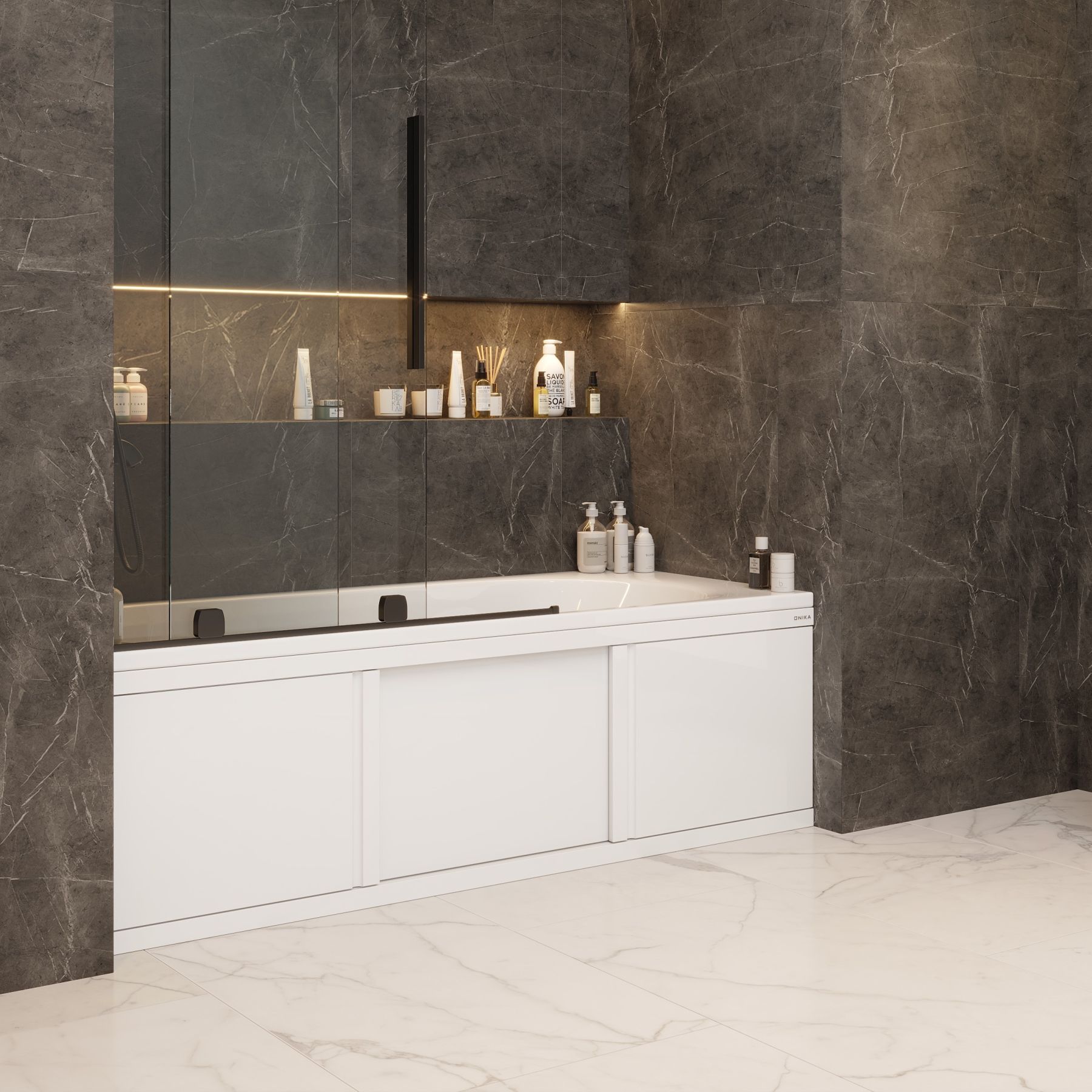 Экран Onika обладает повышенной износостойкостью, отлично переносит эксплуатацию в помещении с высокой влажностью и хорошо сочетается с любыми ваннами.