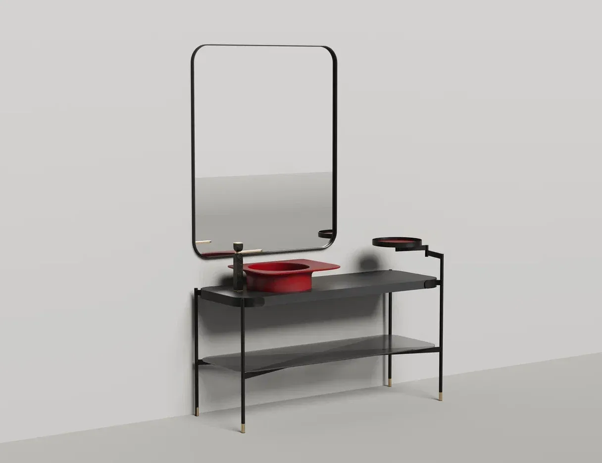 Каркас из чёрного металла с отделкой из латуни дополнен столешницей из материала S-Stone и полкой из рифлёного стекла, напоминающего поверхность водной глади. Зеркало в скоординированном дизайне создаёт законченный образ.