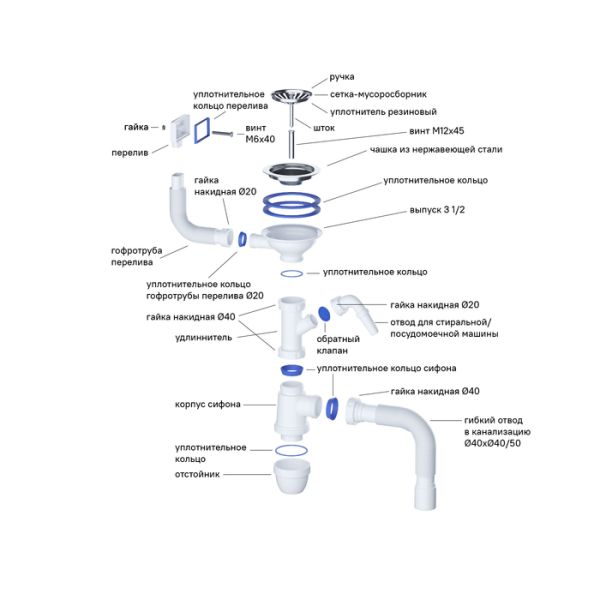 Есть все для монтажа: выпуск, сифон, уплотнительная лента, крепеж.