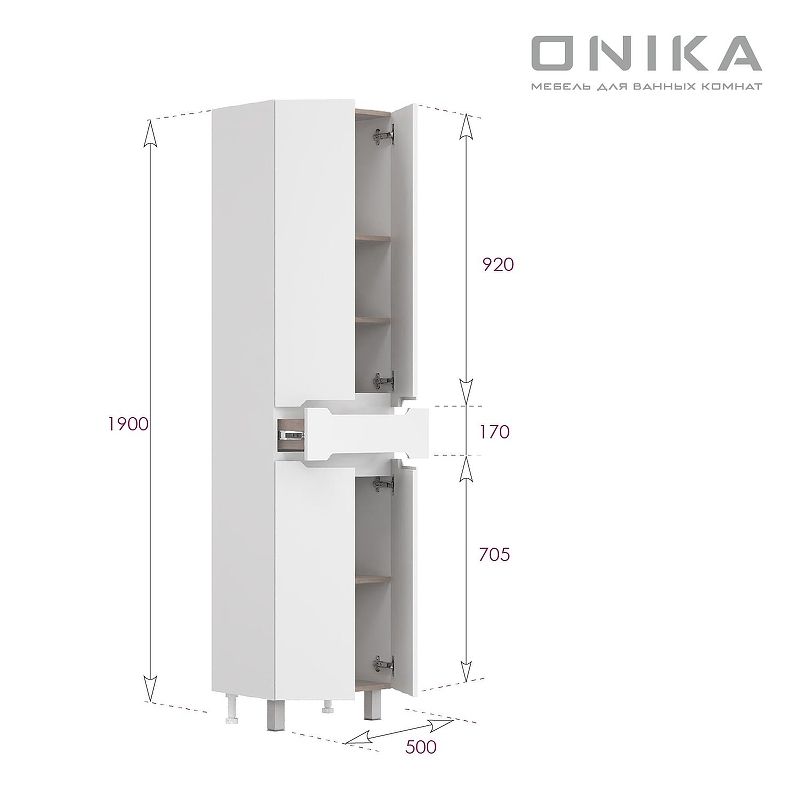 Напольный пенал для ванной комнаты Onika Айленд 50 сочетает в себе стильный минималистичный дизайн, белую глянцевую поверхность и высочайшее качество исполнения.