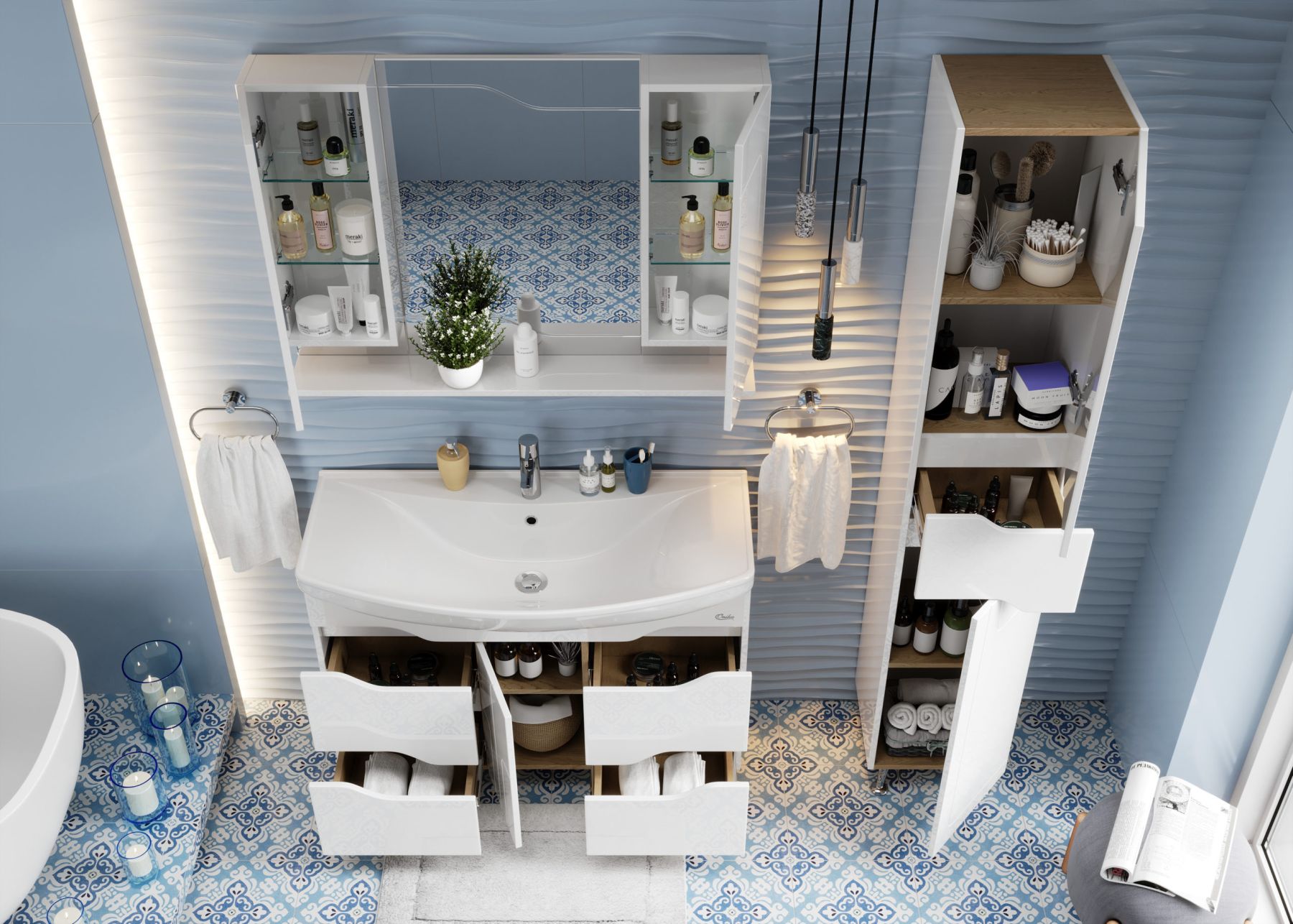 Удобный ящик с направляющими полного выдвижения посередине пенала и два больших отделения, разделенное полками, за распашными дверцами с механизмом плавного закрывания - отличное место для хранения необходимых вещей.