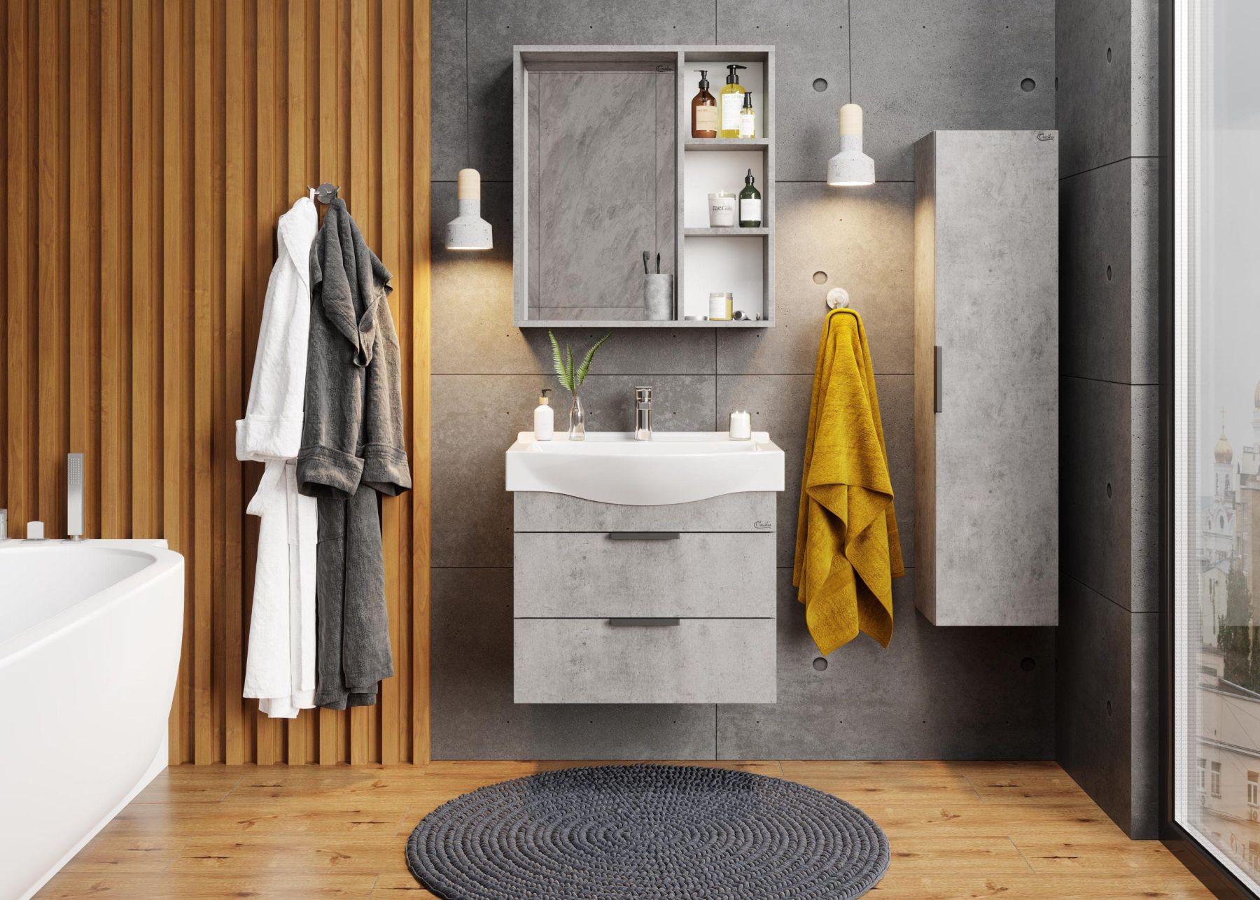 Подвесной шкаф пенал для ванной комнаты Onika ДЕВИС 30 отличается чёткой геометрией форм и создан для тех, кто ценит современный лаконичный дизайн, холодный брутальный эффект бетона чикаго, а также безупречное исполнение.