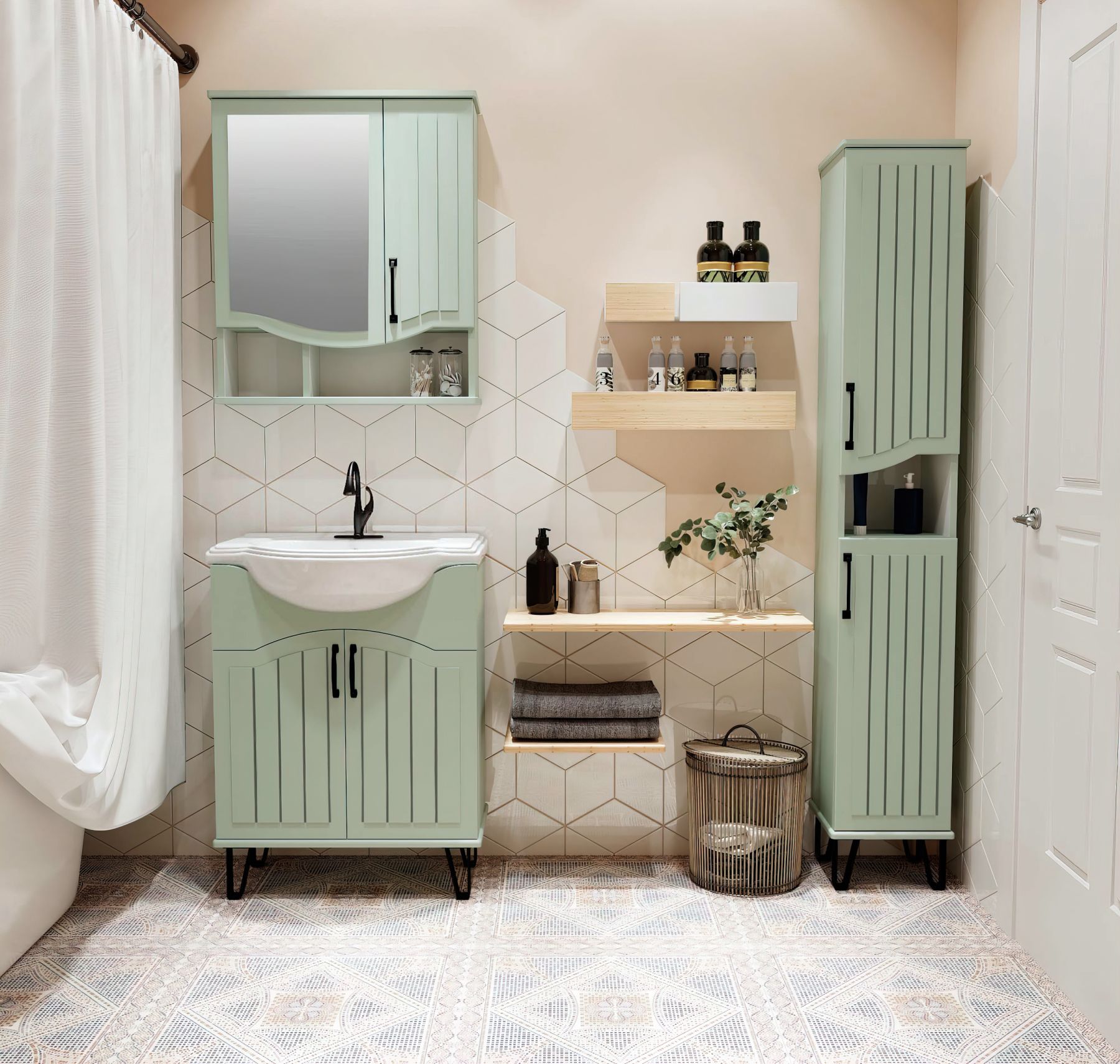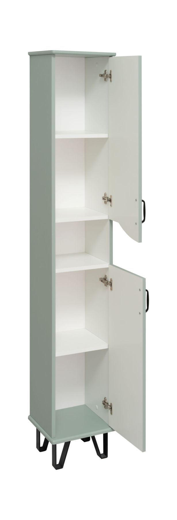 Шкаф-колонна напольный с двумя распашными дверками и открытой нишей посередине. В верхнем и нижнем отделениях по одной встроенной полке. Петли со встроенным доводчиком, ножки черные пластиковые -4шт, ручки черные -2шт. Корпус и фасады покрыты пленкой в цвете мята, что в сочетании с черной фурнитурой делают мебель стильной и оригинальной. Выпускается только в правом исполнении.