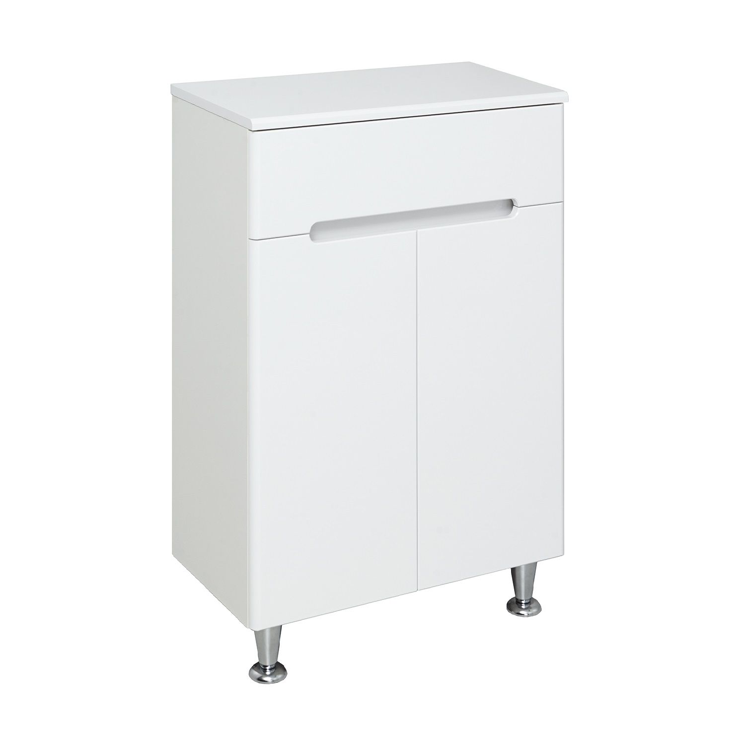 Тумба в ванную (полупенал) с одним выдвижным ящиком и двумя распашными дверками. В нижнем отделении - одна внутренняя полка. Петли со встроенным доводчиком, ящик на шариковых направляющих полного выдвижения.