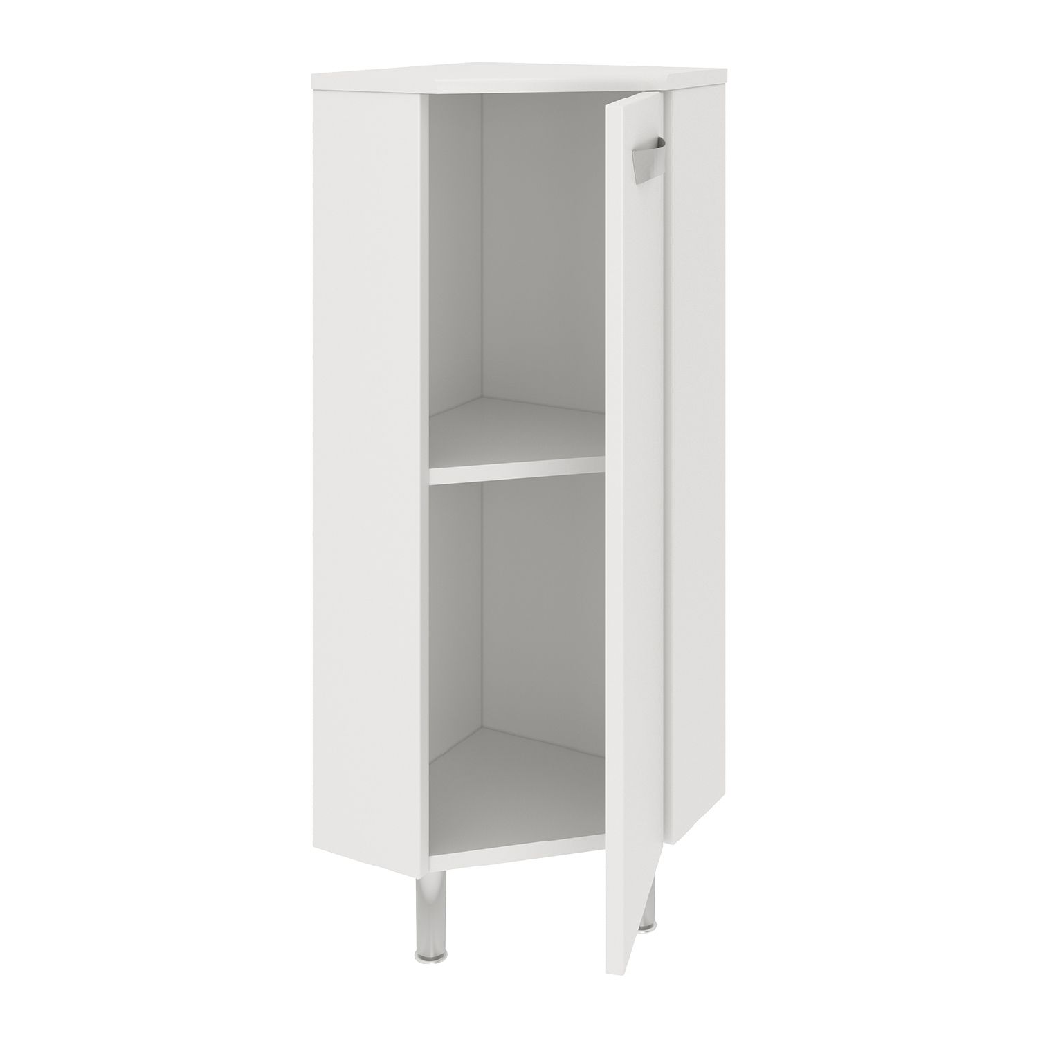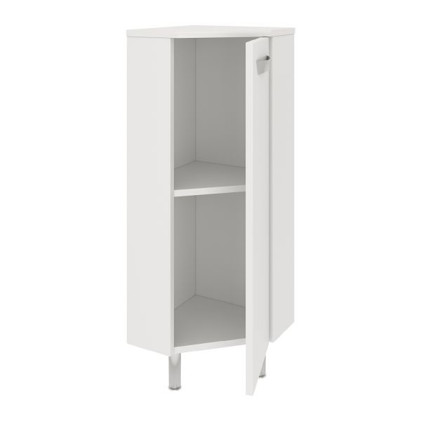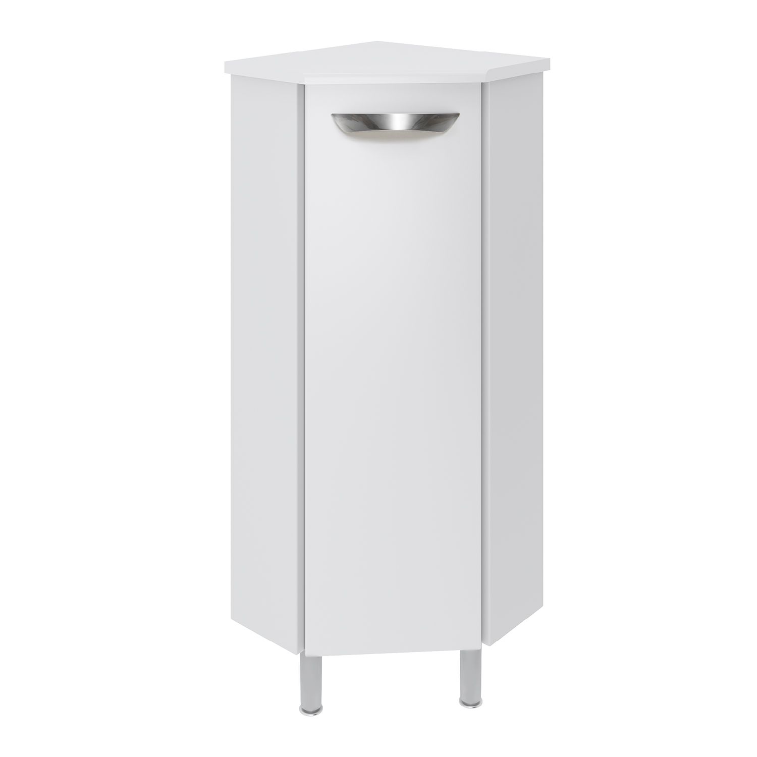 Тумба в ванную (полупенал) угловая с распашной дверью, за которой одна встроенная полка. Петли со встроенным доводчиком, ручка - 1шт, ножки хром - 2 шт, ножки пластик -1шт. Выпускается только в правом исполнении.