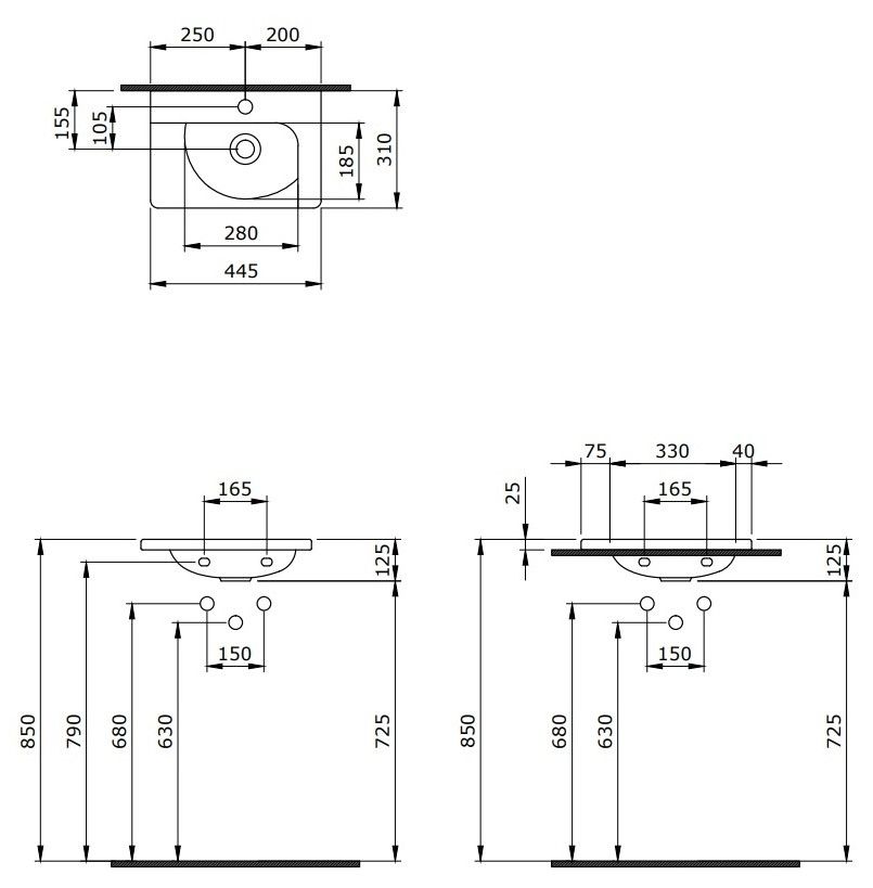 • Отверстия под смеситель: