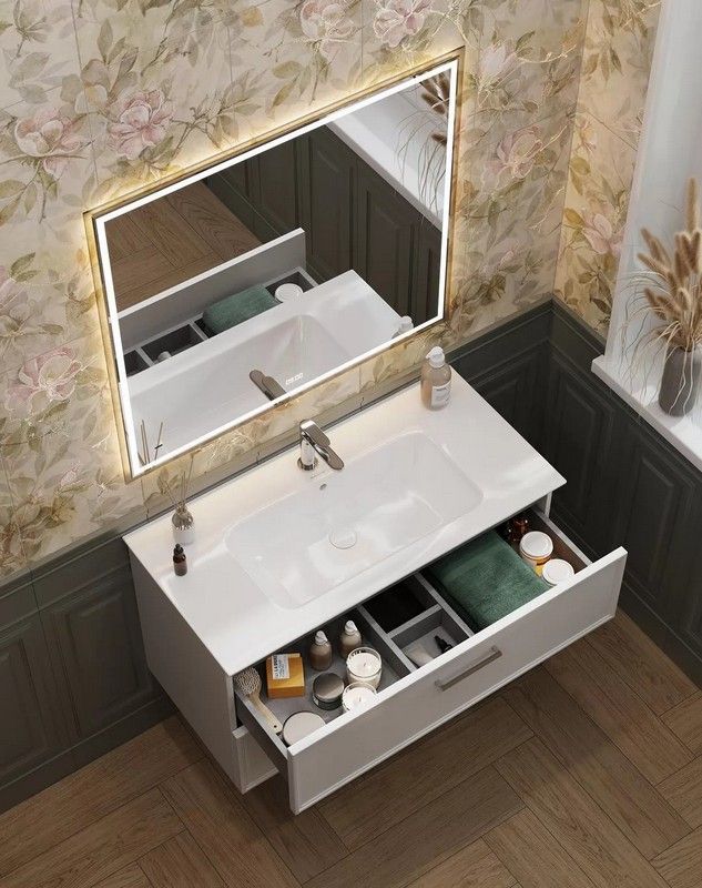 Тонкая белая глянцевая мебельная раковина с неглубокой чашей и отверстием под смеситель, ширина 95 см. Раковина с отверстием слив\перелив, расположение чаши в центре раковины. Донный клапан в комплект не входит, рекомендованный донный клапан DRR.1/WHT.