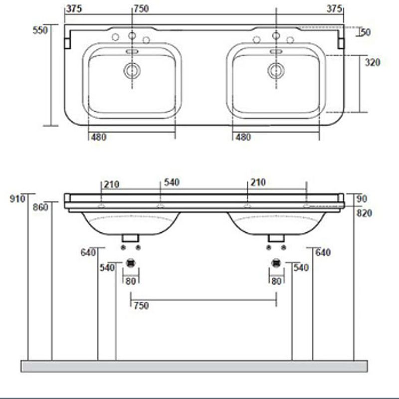 Раковина Kerasan Waldorf 4143K1bi/cr*3 Белая 150 см