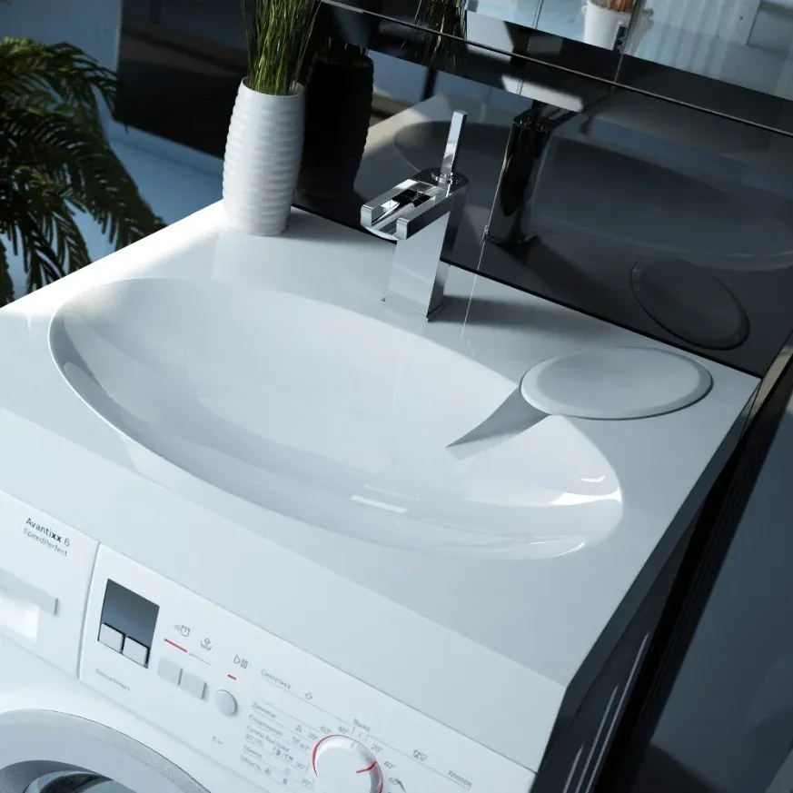 Подвесная раковина для ванны повторяет габариты большинства современных стиральных машин: 60х55 см. Из-за уменьшенной глубины (всего 9,2 см) мойка не выступает высоко над стиральной машиной. Она образует с ней стилистически цельный элемент интерьера и выглядит как верхняя часть единого ансамбля.