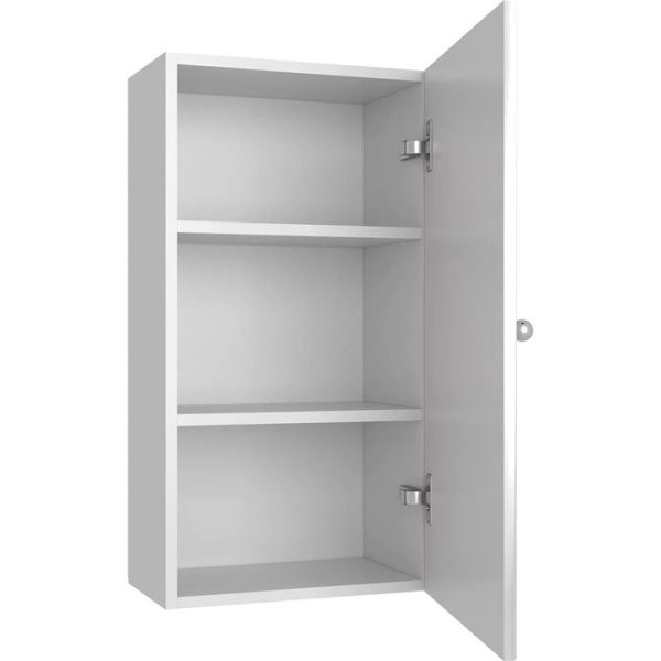 Шкаф навесной с одной распашной дверкой, за которой - две встроенные полки. Петли со встроенным доводчиком, ручка - 1шт, навесы 2шт. Универсальный.