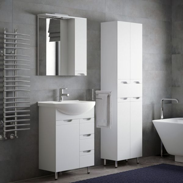 Шкаф-пенал Corozo Лея 50 Z1, 50 см, цвет белый, SD-00000001Коллекция мебели для ванных комнат "ЛЕЯ" создана для тех, кто ценит простоту форм, сочетание округлых и прямых линий, удобство эксплуатации. У мебели коллекции «ЛЕЯ» корпус выполнен из ЛДСП, фасады - из влагостойкой плиты МДФ, покрытие – пленка ПВХ. Мебель оснащена доводчиками. Модель пенала разделена на две автономные секции, на которых предусмотрено по две распашные дверцы и один выдвижной ящик высотой 160 мм по центру. Позади створок - по одной вкладной полке. Устойчивость конструкции обеспечивают четыре металлических хромированных опоры. Фурнитура с лицевой стороны фасадов отсутствует, вместо нее предусмотрены интегрированные ручки с декоративной полосой тонкой фрезеровки. Бесшумность и долговечность эксплуатации обеспечивают надёжные системы мягкого закрывания – роликовые направляющие и петли с доводчиками.