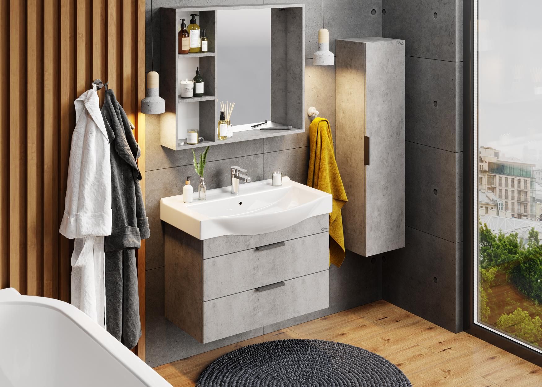 Навесной зеркальный шкаф для ванной комнаты Onika ДЕВИС 80 отличается чёткой геометрией форм и создан для тех, кто ценит современный лаконичный дизайн, холодный брутальный эффект бетона, а также безупречное исполнение.