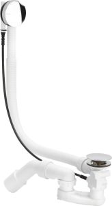 гибкая переливная труба, хромированная поворотная накладка переливного отверстия (верхняя), хромированная пробка донного клапана со штоком, гидрозатвор, отводящее колено 45°, донный клапан - нержавеющая сталь