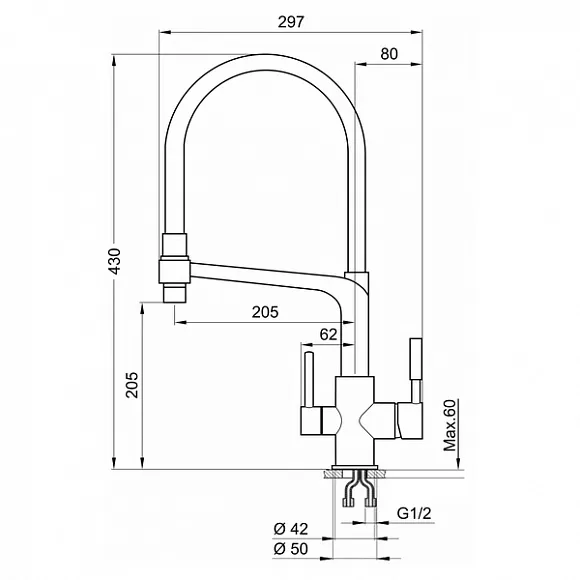 Смеситель для кухни. Цвет-графит. В комплект поставки входит: смеситель, гибкая подводка, комплект креплений, переходник для подключения фильтра с питьевой водой