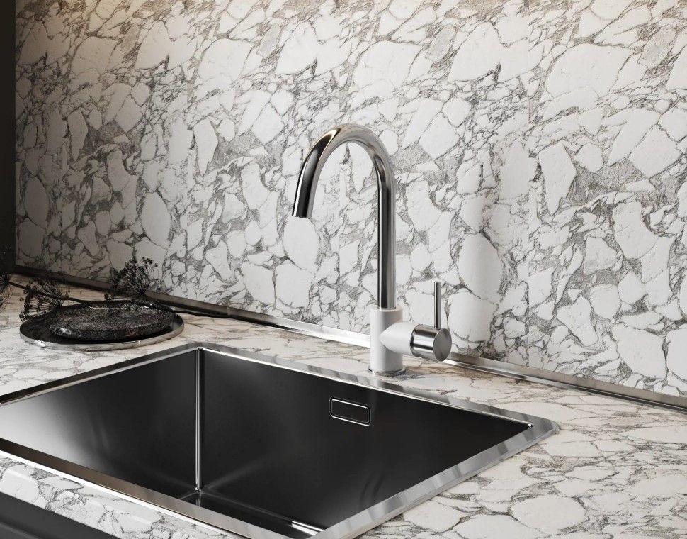 • Высокий корпус и поворотный излив дает больше возможностей при использовании на кухне.