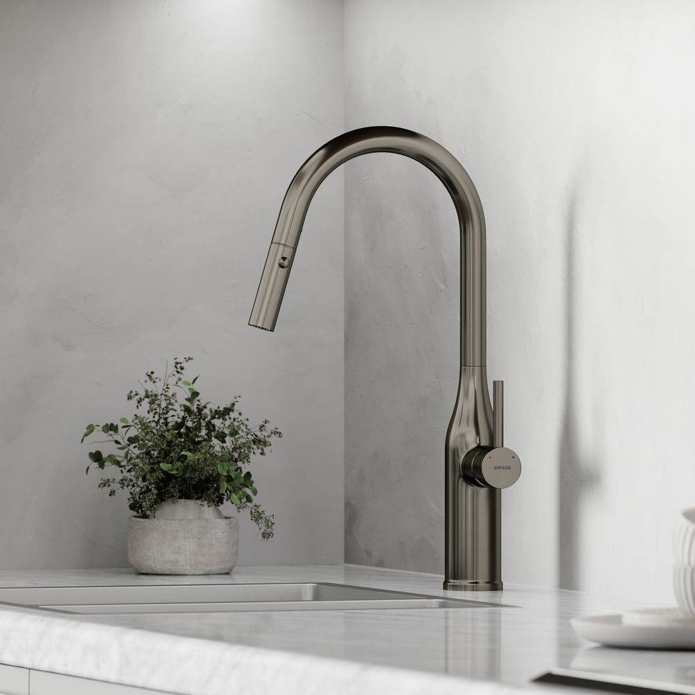 Смеситель для кухни SANCOS Grand c вытяжным и поворотным изливом, цвет вороненая сталь, арт. SC4002GGС возможностью регулировки температуры водыАэратор, гибкая подводка, ключ и крепления для монтажа, ключ для обслуживания аэратора