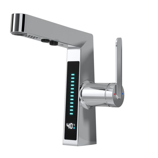 Смеситель датского производителя Black&White в цвете хром. Изделие реализовано в минималистичном дизайне и изготовлено из сантехнической латуни, что увеличивает срок службы и исключает возможность появления коррозии. В нижней части корпуса расположен дисплей с показаниями температуры воды с соответствующей подсветкой температурного режима. Для его работы не требуется электричество- он работает от машины постоянного тока, при прохождении через него потоков воды. Управление происходит через керамический картридж большой пропускной способности. Важным функциональным элементом можно отметить вытяжной излив с поворотным аэратором, на котором также дополнительно есть функция изменения поток воды.