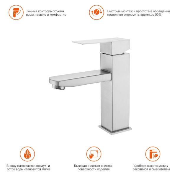Смеситель для раковины Prohanss P30.10.05, сатин — это идеальное сочетание современного минималистичного дизайна и высокого качества. Изготовленный из нержавеющей стали этот кран для умывальника обеспечивает долговечность и надёжность в использовании, а также устойчивость к механическим повреждениям. Механизм смесителя для раковины основан на керамическом картридже с рычажным управлением, что гарантирует лёгкость и точность регулировки температуры и напора воды. Его минималистичный дизайн станет настоящим украшением вашей ванной комнаты, гармонично вписываясь в любой интерьер благодаря лаконичным формам и элегантным линиям.