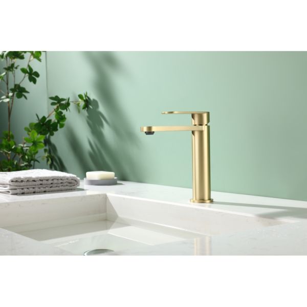 Смеситель для раковины R10.10.03. Однорычажный смеситель для раковины (для умывальника) в ванную, выполненный в цвете "золотой сатин" (матовое золото). Соответствует требованиям международного стандарта. Одна рукоять для регулировки воды. Аэратор для водопроводной воды Neoperl® с функцией самоочистки гарантирует одинаковый поток воды, сеточка рассеивает напор, вода смягчается. Смеситель устанавливается на гайке, нижняя часть смесителя вставляется в отверстие для монтажа и затягивается гайкой для фиксации. Данный смеситель для умывальника имеет надежный стационарный излив, не меняющий своего положении. Смеситель прекрасно смешивает потоки воды, а помимо этого обладает невысоки показателем шумов. Быстрый монтаж. Гарантия производителя 5 лет.