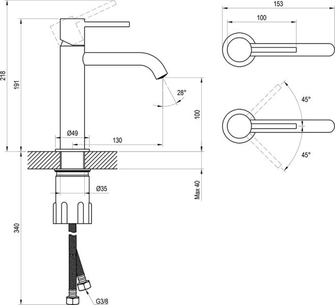 • соединительные шланги: гибкие 450 мм, диаметр DN6, G3/8