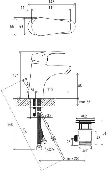 - соединительные шланги: гибкий 350 мм, диаметр G3/8
