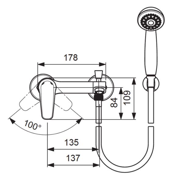 BALANCE Настенный смеситель для ванны/душа, душевой гарнитур в комплекте (душевая лейка Ø70 мм, металлический шланг 1500 мм, держатель для лейки).