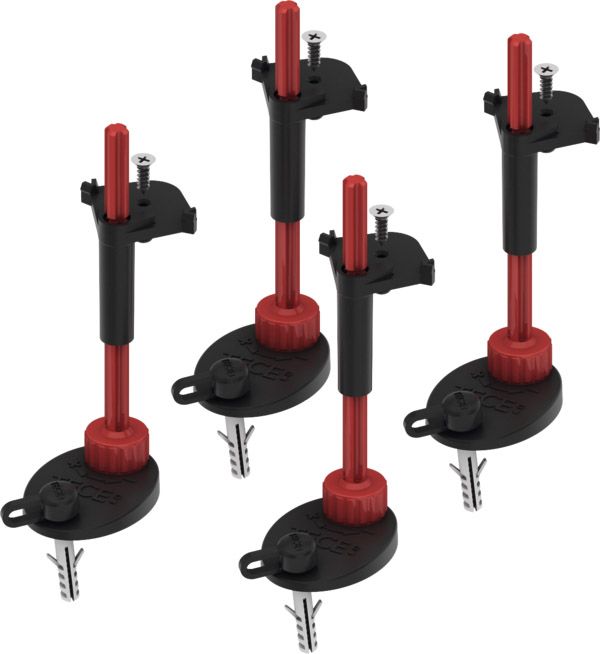 Комплект опор для сифонов TECEdrainpoint S с универсальным фланцем Seal System для регулирования высоты и крепления на этапе монтажа до окончательной отделки. Регулировочный диапазон он нижнего края опор до верхнего края универсального фланца: 64–165 мм В комплекте 4 опоры для трапа с шумопоглощающим элементом и крепежными элементами