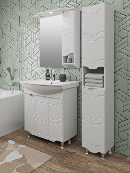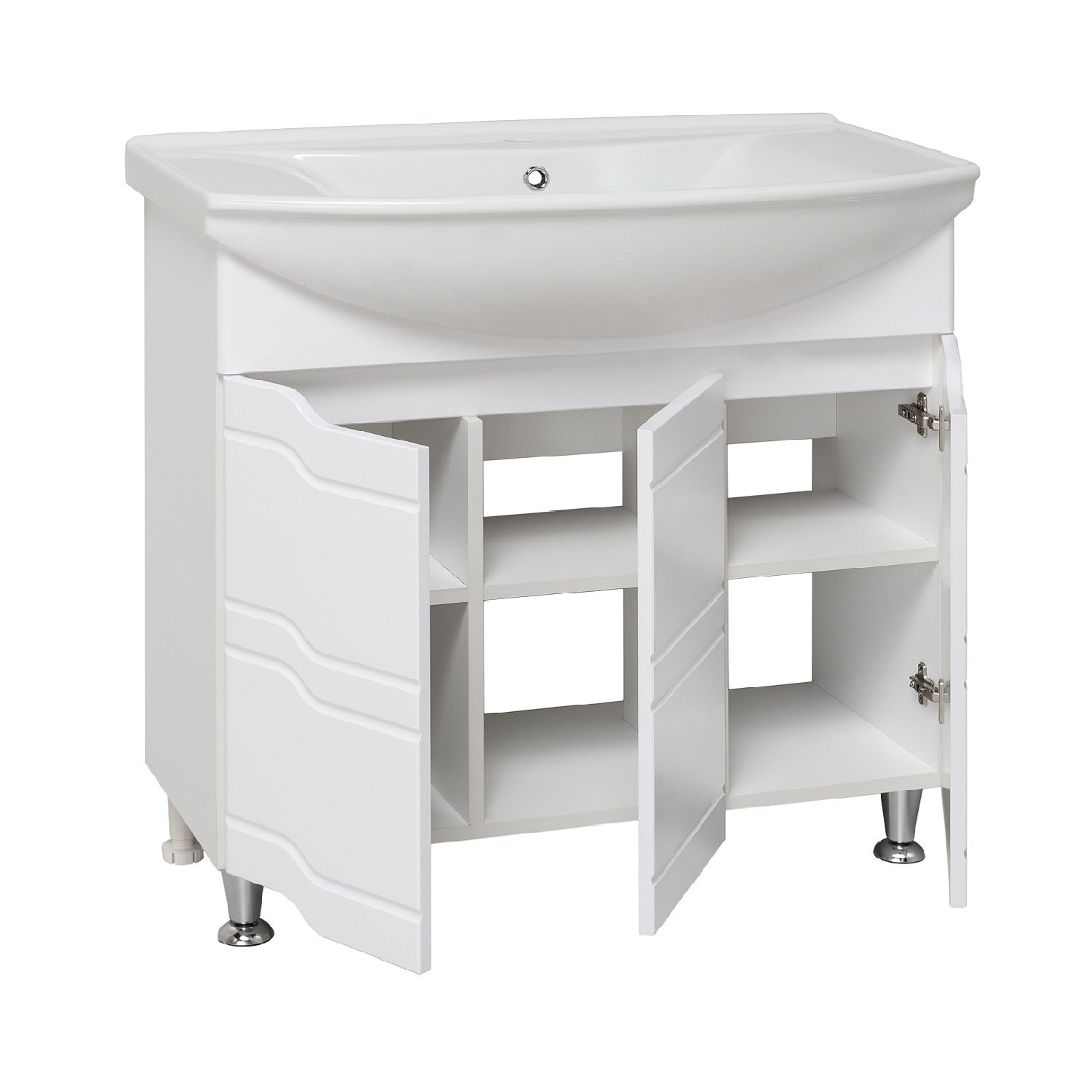 Тумба под умывальник напольная с тремя распашными фасадами и одной внутренней полкой. Петли со встроенным доводчиком, ножки хром - 2шт, ножки пластик -2шт.