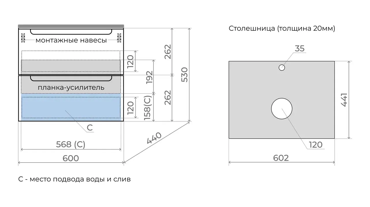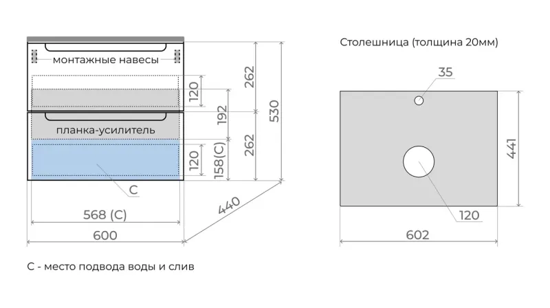 - Тумба подвесная со столешницей (ш/г/в): 600x450x530 мм